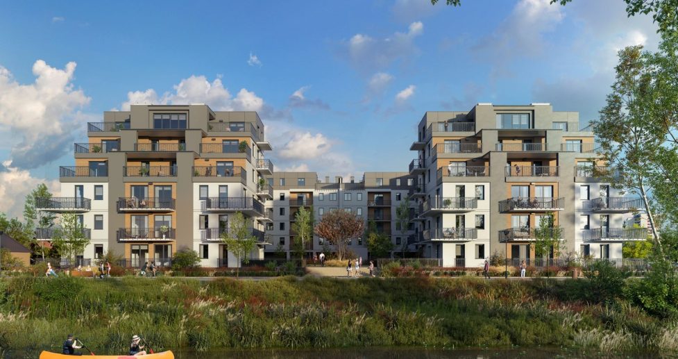 Charakterystyczne kaskadowe tarasy podkreślają największy atut inwestycji – widok na rzekę i wiekową zieleń.